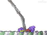 The protein molecule kinesin walks along a pre-prepared track inside a cell.