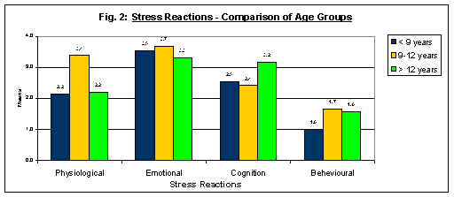In order to examine the new hypothesis, the children were divided into three age groups: up to 9 years old; 9 12 years old and 12+ years old. Figure 2 presents stress reactions in the various age groups.