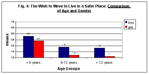 Boys prefer more than girls to change their living place in the future and move to live in a safer place. This preference is higher with the younger children (age 6 - 9) and it decreases - both for boys and girls - in the older age.