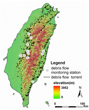 However, the torrents that are likely to cause debris flows in Taiwan are mostly 500~ 2000 m long. Consequently, when a debris flow occurs, the time for residents' response after the warning from the monitoring station's instrument is less than 10 minutes (Chen, 2002). Therefore, the response time for early warning instruments of field monitoring is too short, and systematic evacuations cannot be carried out (Chen, 2002). In addition, not all debris flow torrents can be included in the current monitoring stations due to limited funds. Therefore, the main task of monitoring stations is not the release of real-time warnings, but gathering field observation data of debris flows in Taiwan, which would enable knowledge of the movements and occurrence mechanisms of debris flows. Moreover, in order to improve the monitoring mobility of debris flows, two mobile debris flow monitoring stations are developed (Fig.2[c]), which can be sent to debris flow torrents that are in the predicted route of a typhoon.