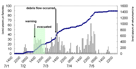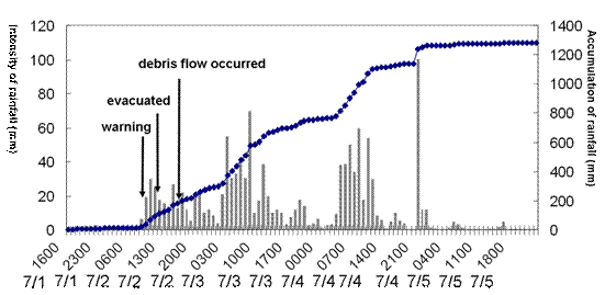 Typhoon Mindulle of 2004 caused debris flow disasters in several locations, and damaged houses and bridges. However, there were no casualties due to the debris flow warning, allowing residents to be evacuated beforehand (Fig.9).