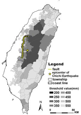 The debris flow warning is released according to the rainfall threshold value for debris flow warning of different zones. At the initial stage, it is determined one by one, using the concept of cumulative probability and analyses of the effectives of rainfall accumulation after each rainfall event according to the geologic features, hydrological conditions, and historical data of debris flows of different zones. The warning value is between 200 ~ 550 mm, and is divided into eight levels (Fig.3[a]). After the Chichi Earthquake, the rainfall threshold value for warnings in the primary influence areas is set at a low standard, since loose soil materials are likely to cause debris flows (Fig.3[b]). The real-time observation data from 153 automatic rainfall stations of CWB were synchronously obtained online, beginning in 2002, and integrated into the Debris Flow Disaster Response System.