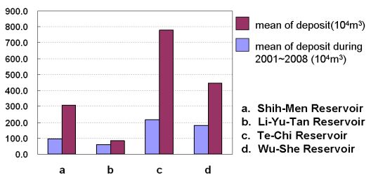 | Fig. 15 Statistics of historical and mean annual sediment yields of reservoirs in central area of Taiwan between years 2001 to 2008 (WRA, 2008). | |