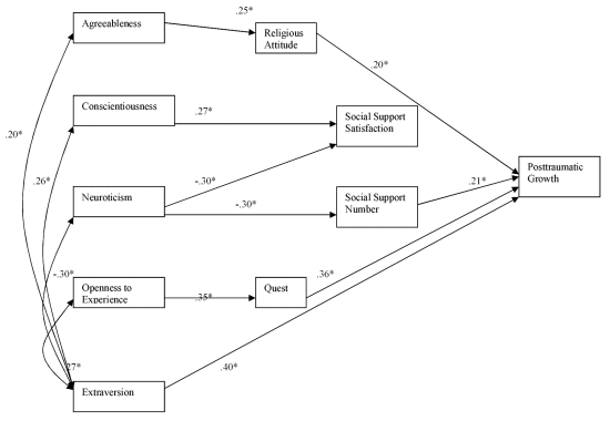 We predicted that the personality dimensions of extraversion, openness to experience, agreeableness and conscientiousness, satisfaction with, and numbers of social support, and religiosity would predict PTG. We further predicted that the personality dimension of extraversion would predict PTG through its relationship with numbers of social support, and that the personality dimension of agreeableness would predict PTG through its relationship with social support (Zellars & Perrewe, 2001), and through its relationship to religion measured by religious attitude (McIntosh et al., 1993). We also predicted that the personality dimension of openness to experience would lead to PTG through its relationship to a Quest orientation to religion (Calhoun, Cann, Tedeschi, & McMillan, 2000).
