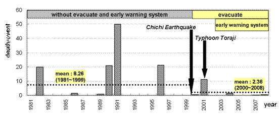 Because of the Chichi Earthquake of 1999, debris flow disasters during heavy rainfall in typhoon are common in Taiwan, and often lead to deaths and property losses. A total of 453 evacuation drills have been conducted since 2000. These evacuation drills have increased the hazard awareness of residents, and evacuation planning has been improved greatly. In addition, as Typhoon Toraji caused severe casualties, the Taiwanese government established an early warning system for debris flow disasters, by mounting 13 debris flow monitoring stations to procure observation data, resulting in the rainfall threshold of different debris flow hazard-prone areas being revised, and the overall mitigation and response operations become mature. Thus, residents of the warned areas can be evacuated effectively in advance and to prevent the occurrences of disasters.