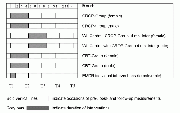 As shown in Figure 1, CROP-Groups, CBT-Groups, and EMDR individual treatment took place between September (T1) and December 2006 (T2), while the CROP-Intervention for the Wait-List group took place between December 2006 (T2) and March 2007 (T3). Alternatively, for the Wait-List Group the intervention could have been offered at T4 as one reviewer suggested. Thus, the effect of a longer waiting time could have been studied. To us, for ethical reasons, however, a longer waiting time seemed unacceptable for ethical as well as for practical reasons. Assessments were made prior to (T1) and at the end (T2) of the interventions as well as at a three- and a six-months follow-up. Thus, follow-ups took place at T3 and T4 for the initial CROP-, CBT-, and EMDR-condition and at T4 and T5 for the Wait-List condition.