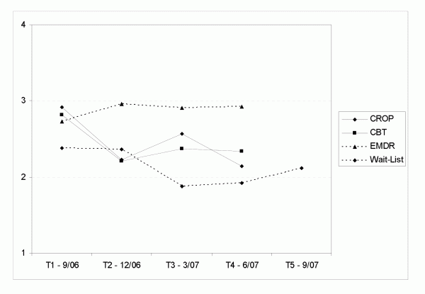 As can be seen from Figure 2, the CROP and the CBT Group improved markedly during the interventions between T1 and T2 and the Wait List Control Group did so during the intervention which took place between T2 and T3. In contrast, the EMDR Group did not improve. For the HTQ, Repeated Measures ANOVA revealed that the CROP-Groups (N = 12) were significantly superior to the Wait-List condition (N = 16), as far as improvement from T1 to T2 is concerned (p = .002) and thus, Hypothesis 1 was confirmed. According to Hypothesis 2, we had expected that the CROP-Condition, the CBT- and the EMDR-condition would not differ significantly from each other over T1, T2, T3, and T4, or that CROP would be significantly superior to CBT and EMDR. Repeated Measures ANOVA showed that CROP (N = 9) and CBT (N = 10) did not differ significantly from T1 to T4 (p < .549). The CROP-Condition (N = 9) was significantly superior to the EMDR-Condition (N = 5) from T1 to T4 (p < .005). Thus, Hypothesis 2 also was confirmed with respect to the HTQ. Hypothesis 3 had postulated that the CROP-Groups, as compared to the Wait-List condition would achieve effect sizes of at least 1.00. The initial HTQ mean scores at T1 for the CROP-Group and the Wait-List Control Group were 2.87 (SD = 0.55, N = 12) and 2.58 (SD = 0.58, N = 16) respectively. At T2, the CROP-Group had a mean of 2.20 (SD = 0.65, N = 12), while the Wait-List Control Group had a mean of 2.48 (SD = 0.66, N = 16). From these data, an effect size of 0.94 was computed. Thus Hypothesis 3, which had predicted an effect size of at least 1.00 was not confirmed.