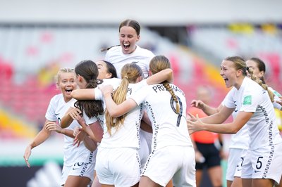 Kate (top) with the Junior Football Ferns against Colombia at the 2022 Women's Under-20 World Cup (Photo by Jenny Chuang)