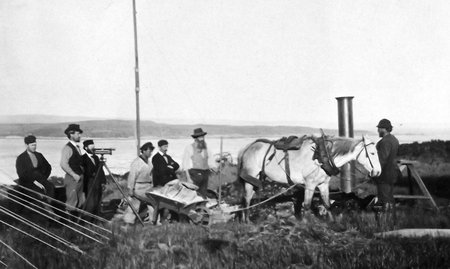 Locals helping expedition members set up water casks for the photographic house at Port Hutt, Chatham Islands. Source: Library Company of Philadelphia.