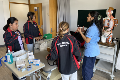 Following that, the students got hands-on experience in the Nursing Simulation Lab lead by Senior Tutor Andrea Thomson, where current Massey nursing students showed the tamariki how to use stethoscopes and hospital beds. The tamariki applied a glow-in-the-dark goo to their hands, washed it off and then looked at their hands under ultraviolet light to determine any spots their handwashing had missed.