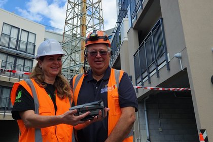 Associate Professor Renata Jadresin-Milic from Unitec and Professor Regan Potangaroa from Massey capturing drone footage from outside the drop zone of the shot tower.
