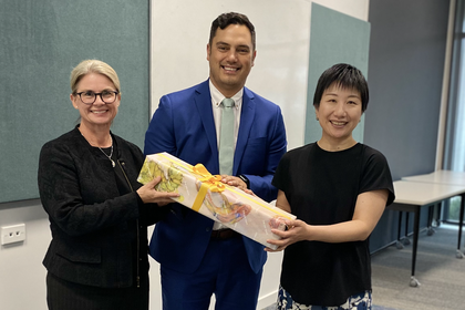 PaCE Director Andrea Flavel and Deputy Vice-Chancellor Students and Global Engagement Dr Tere McGonagle-Daly present Meisei's Vice Dean of International Studies Centre Professor Ai Fujiwara with a gift to celebrate the 20-year partnership.