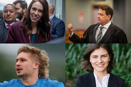 Four of this year's finalists, clockwise from top left: Prime Minister Jacinda Ardern; Crown Solicitor Brian Dickey; Green MP Chlöe Swarbrick; and All Black Jack Goodhue.
