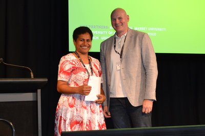 Salanieta Naliva receiving her prize for winning the three-minute research presentation competition from Riddet Institute board member and acting chair Mark Piper.