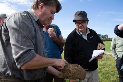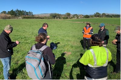 Massey staff discussing soil properties on Massey’s No.4 Dairy farm in the Manawatū.
