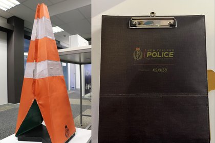 A collapsible road cone and investigators notebook made using recycled Kevlar from Police body armour.
