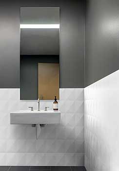 How a bathroom would look with recycled polymer replacing traditional ceramic tiles.