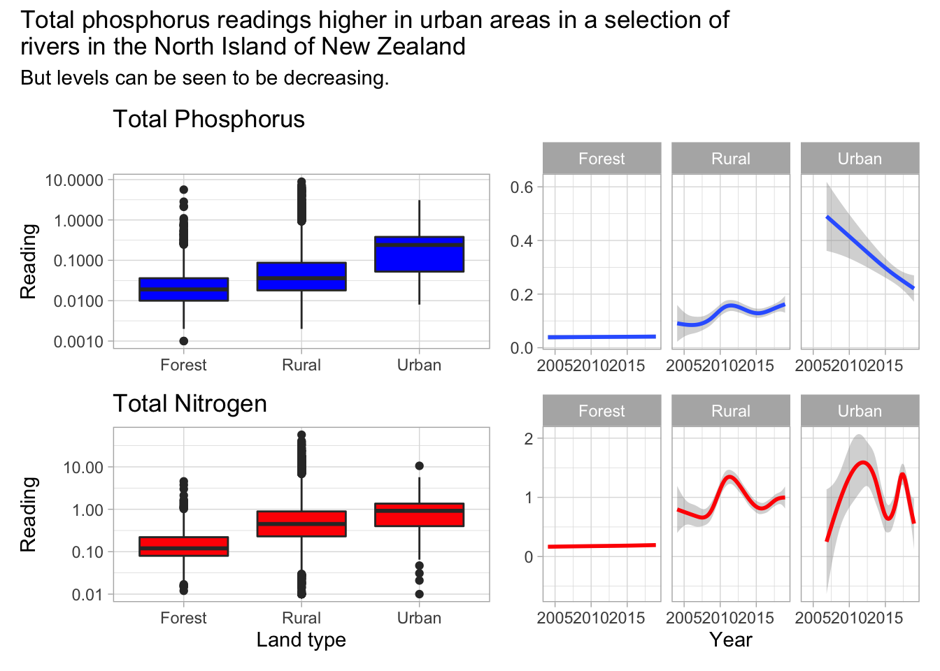 I chose to focus on two measures, total nitrogen and total phosphorus and compare these across the three land types, rural, urban and forest. I chose to use a box plot to compare the values for the total nitrgoen and total phosphorus for the three land types as this gave a good visual comparison across the groups. I used geom_smooth to show if there was a trend in the readings over time at the different areas. I chose to smooth the data as without this, it was very busy and a trend could not be easily visualised. The graphs show that the median readings for both total nitrogen and total phosphorus are higher in urban sites then forest and rural but more so for total phosphorus. However, it can also be seen that for total phosphorus, levels are decreasing at urban sites where as for total nitrogen they seem to be fluctuating throughout the years. The levels of both measurement for forest land are the lowest of the three and appear to be remaining steady neither increasing or decreasing.