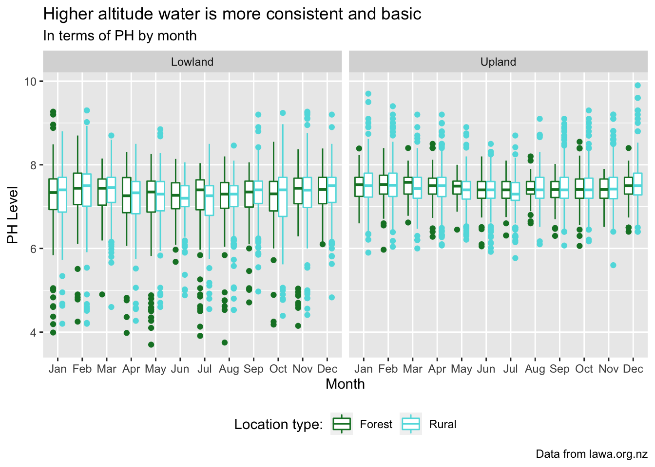 labs(y="PH Level", x="Month", colour="Location type:", caption = "Data from lawa.org.nz",