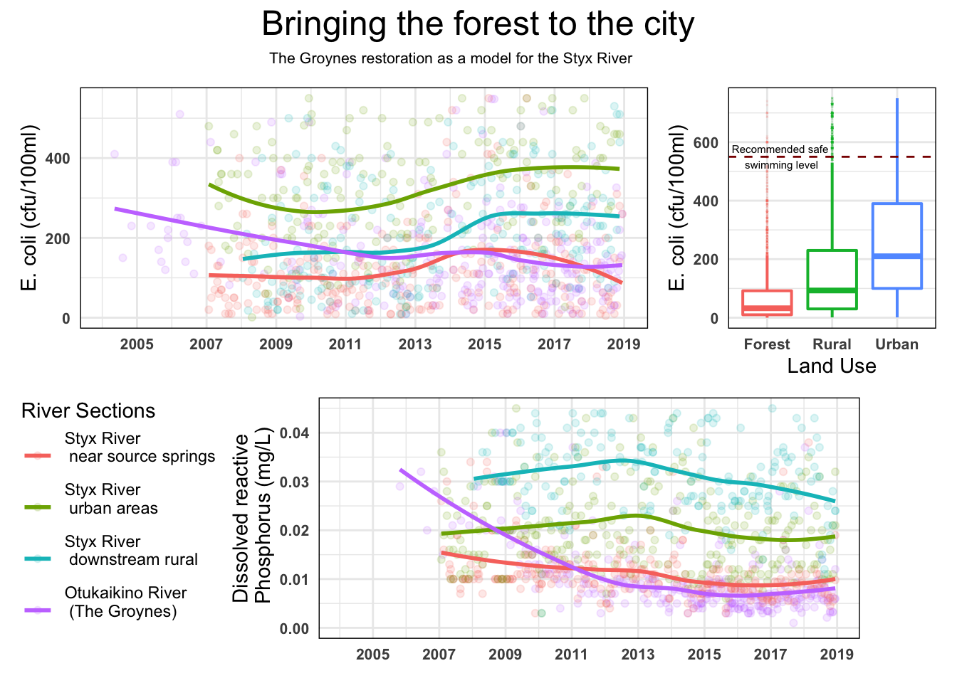 The water quality measures, especially in E. coli, between the urban, rural and forest land use show results that may be against the current public perception of rural / urban water quality. Considering the ambition to plant 1 billion trees, targeting some of that project towards riparian planting in urban areas may assist in improving water quality.