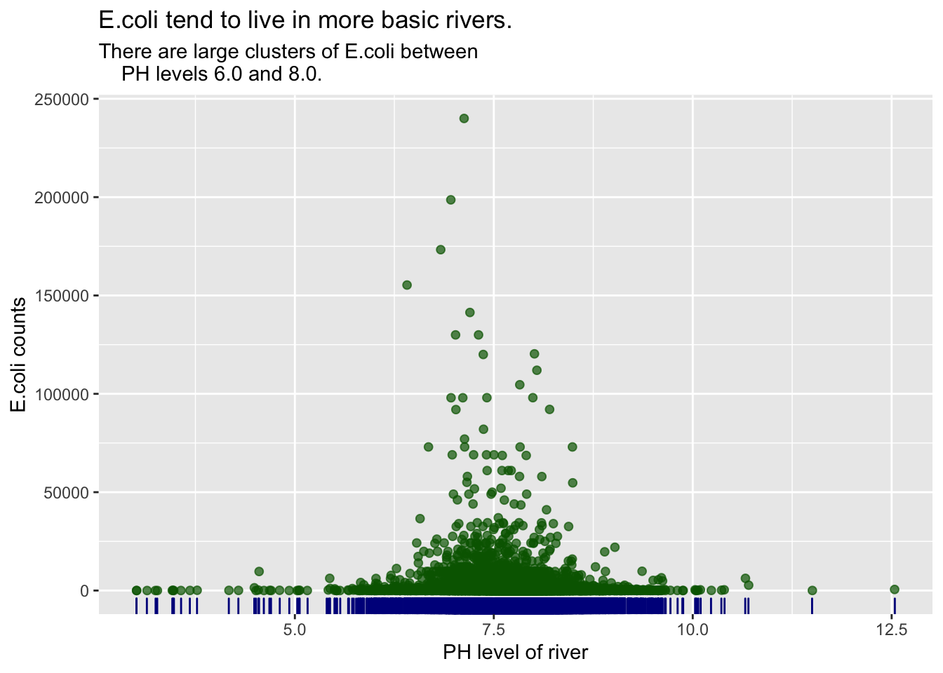 I chose to compare PH levels of rivers with E.coli count to show river quality. I chose to find if there was a correlation between them, to find the preferred environment of the E.coli.I decided that I wouldn’t use the data of PH below 3 because it didn’t show much and made the data extremely left skewed and I was unable to see the smaller details in the clustered data. I decided to use geom_point because I liked being able to see the extreme counts of e.coli and PH levels. I choose to use alpha = 0.7 as I am able to see the extreme values and tell where the large cluster starts to defuse. I chose to use a rug to show how clustered the slight left skew was, as well as getting more indication on when the edges of the cluster started to thin out. The graph shows that larger populations of e.coli live in waters with a PH level between 6 and 8, not only does the higher numbers of e.coli live in these water levels but most of the cluster falls within these levels. Outside of the main cluster is very few e.coli, which shows that they likely can’t live outside of the cluster PH.