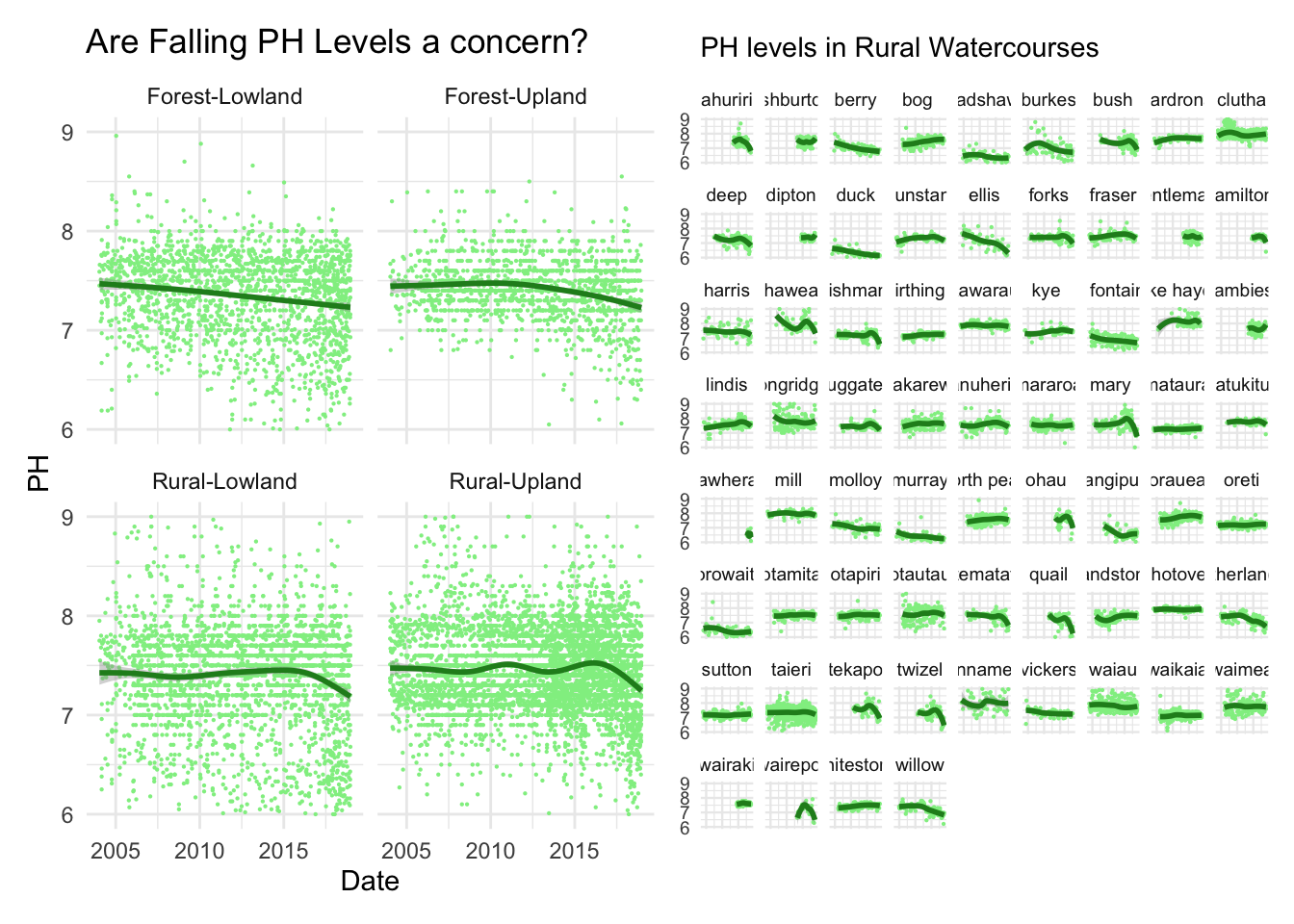 p1+ ggtitle("Are Falling PH Levels a concern?")+p2 + ggtitle("PH levels in Rural Watercourses")