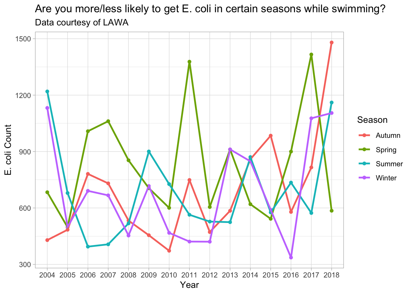 labs(title="Are you more/less likely to get E. coli in certain seasons while swimming?", subtitle="Data courtesy of LAWA") +