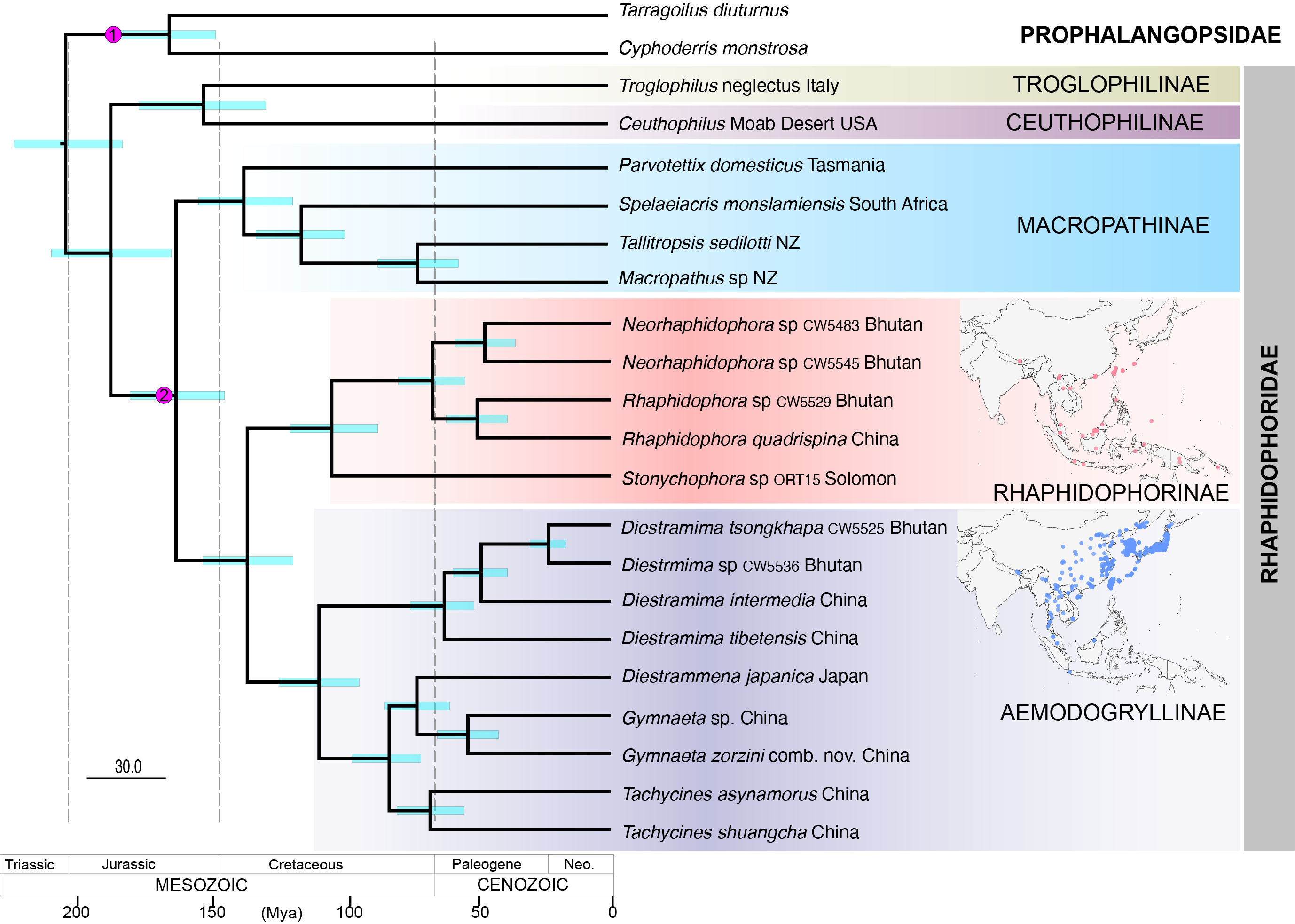 Chronogram of Rhaphidophoridae focusing on Asian lineages inferred by Bayesian analysis of 13 protein coding genes calibrated with fossil and secondary calibration points and a relax molecular clock. Calibration (1) fossil Aboilus, (Porphalangopsidae) at approximately 172 Mya and (2) secondary calibration point at 160 Mya as node age of Macropathinae and Aemodogryllinae+Rhaphidophorinae.
