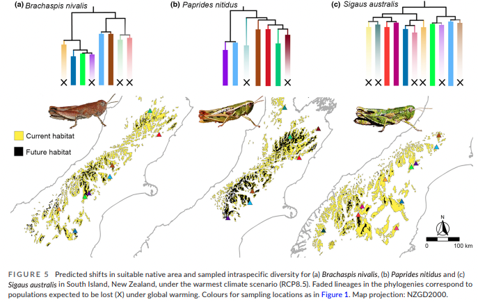 Meza-Joya FL, Morgan-Richards M, Koot EM, Trewick SA. 2023. Global warming leads to habitat loss and genetic erosion of alpine biodiversity. Journal of Biogeography 50: 961–975 https://doi.org/10.1111/jbi.14590