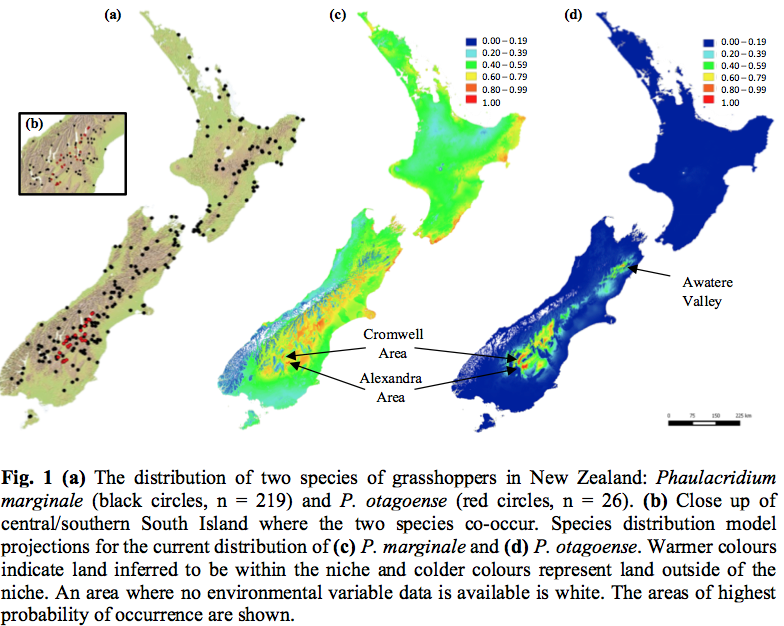My MSc research was a study of the evolutionary and ecological interactions of New Zealand Phaulacridium grasshoppers using a combination of spatial, climatic, morphological and phylogeographical data. There are two species of Phaulacridium endemic to New Zealand, the larger P. marginale recorded throughout New Zealand and many offshore islands while the other, P. otagoense, is restricted to semiarid habitat in central/southern South Island.