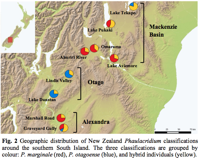 Comparison of morphological and genetic data demonstrates the first reported case of introgression between P. marginale and P. otagoense. It is evident that Phaulacridium hybrids exist in the wild, but it is unknown whether these hybrids are F1 and fertile. Lindis Valley and Lake Dunstan areas appear to be the last strongholds of P. otagoense. Based on historical records of the distribution and the results of the current study, it seems that P. marginale is steadily replacing P. otagoense and this may be facilitated by human modification of landscape and vegetation.