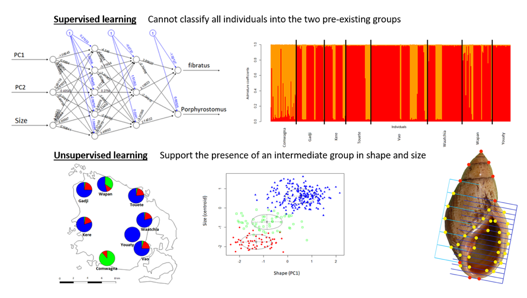 Morphological results so far, which contained a combination of geometric morphometric, supervised and unsupervised learning, did not support the separation of Placostylus into two different groups (species), and highlights presence of intermediate morphological individuals. |