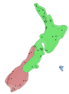 Population clusters of of Pseudopanax crassifolius. Possibly indicating LGM survival. Present in green areas and extirpated from red areas. Blue is Pseudopanax chathamicus. |
