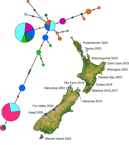 Brushtail possums were introduced to New Zealand in the mid 1800s to establish the fur industry, but have since negatively impacted the country’s flora and fauna. They are carriers of bovine tuberculosis which affect the dairy industry and consequently the economy. There is little information on the intermixing of populations (migration rates) and how this has affected the distribution of genetic diversity across New Zealand. During MSc research I generated and analysed data using mitochondrial and microsatellite markers for samples from 19 locations ranging the country (network of mtDNA haplotypes: right). This was done as a foundational study for further research into their spatial structure for the project: Landscape genetics of brushtail possums (Trichosurus vulpecula) in New Zealand for conservation management.
