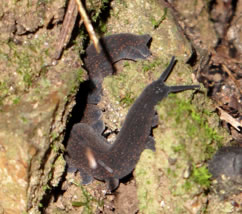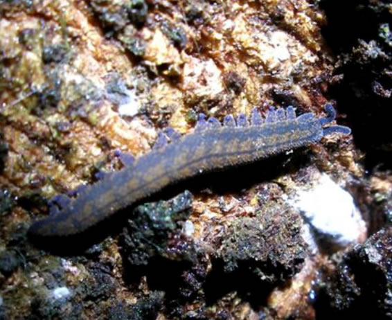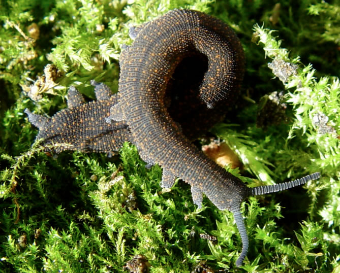 The name Onychophora means ‘claw-bearers’, referring to the claws found at the end of each of their legs. The name peripatus means ‘to walk or wonder about’ but is problematic as a common name becuase it is also a genus name (Peripatus species occur in the New World tropics, not in Australasia). The Maori name, ngaokeoke, also means to crawl. Velvet worms (so called becuase of the soft velvet like cuticle) have no body segments, however their head has three parts, the first contains their two highly sensitive antennae, the second their jaw and mouthparts, and the third the first pair of parapodia-like legs. New Zealand species have either 13, 14, (Ooperipatellus) 15 or 16 (Peripatoides) pairs of legs, and the number of pairs can be used to distinguish between some species. They tend to appear dark blue-grey in colour, but many have orange spots too, and all have a velvety appearance. Peripatoides colour and pattern appears to vary alot, but Ooperipatellus tend to have more regular markings (right hand picture below).