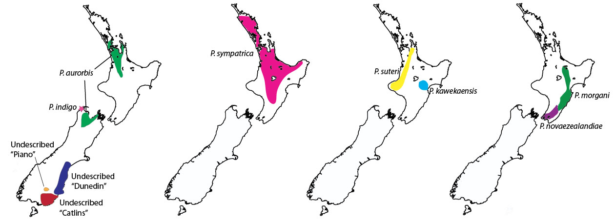 Velvet worms as they are commonly known, are members of the Phylum Onychophora. Globally, 140 species are recognised. There are two living families of these soft bodied animals; the Peripatidae have an equatorial distribution and Peripatopsidae live in southern hemisphere lands, and is this family that is found in New Zealand. There are currently nine named species of Peripatus in New Zealand in two genera. The systematics of these animals has been problematic becuase of their conserved morphology, but molecular data are helping reveal more diversity. In New Zealand, seven species are currently assigned to the genus Peripatoides: P. novaezealandiae, P. suteri and P. indigo, P. aurorbis, P. sympatrica, P. kawekaensis and P. morgani. These are ovoviviparous, giving birth to live young that have developed within their eggs in the mothers twin oviducts. Two other recognised species are in the genus Ooperipatellus: O. viridimaculatus and O. nanus and are oviparous, laying eggs. Among the five live bearing North Island species, the distribution of P. sympatrica overlaps with each of the others. In many cases two species have been found in the same rotting log, but genetic data have shown that there is no interbreeding (Trewick 1998, Trewick et al. 2000). The range of the North Island species group extends across Cook Strait to the top of South Island; a pattern that probably developed during last glacial cycle (~20,000 years ago) when the two main islands were connected due to low sea level. In southern South Island, Ooperipatellas occur mostly west of the the main divide (Southern Alps), but there are Peripatoides in the east with at least two undescribed species near Dunedin (Trewick 1999).