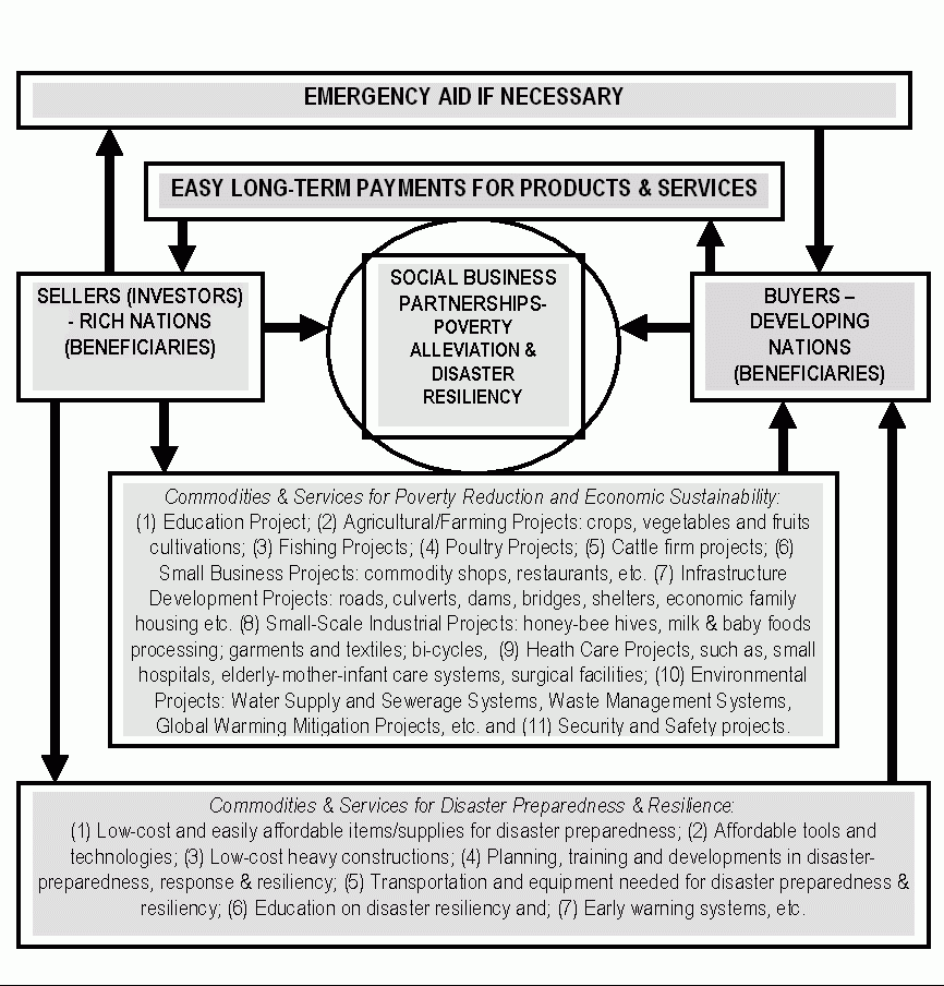 However, the above picture sounds discouraging to both the wealthy and poor countries as the objective of humanitarian aid to heal the psychological, physical and social pains and anguishes of the victims and to build a social resilience virtually got unaccomplished. To meet the objective of humanitarian aid, we believe that our social business partnership model will not only establish significant accountability for the aid recipient countries as they will be obligated to pay to the donors later but also build a solid resilience as the countries will be bound to set up transparent and accountable aid distribution system. Poverty, corruption, inadequate governance, chronic vulnerability to unrest, conflict and state failure (Rogerson, A., Hewitt, A., and Waldenberg, D. 2004) coupled with economic inabilities, resource lacking and human inabilities/incapacities cannot be solved without intervention with pragmatic and sustainable plans. As long as these will remain in the developing countries, disaster-resilience plan would not be attained by extending humanitarian operations during and aftermath of natural disasters. Therefore, human development through social partnerships by using the concept of social capital, social creativity and social entrepreneurships seems to have been a strongest way to achieve effective resilience, disaster mitigation and sustainable developments. .