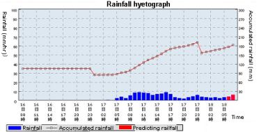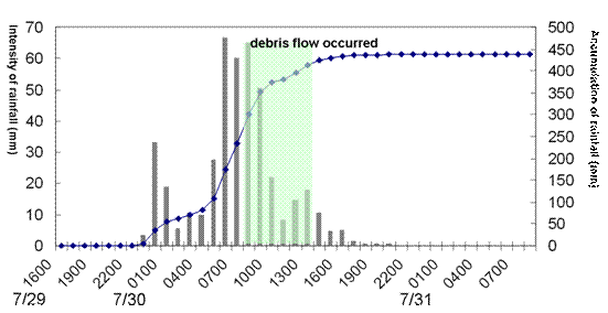 Fig.13 Intensity and accumulation of rainfall at Minduyou Community during Typhoon Aere of 2004. |