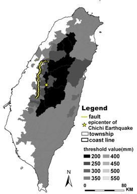 The debris flow warning is released according to the rainfall threshold value for debris flow warning of different zones. At the initial stage, it is determined one by one, using the concept of cumulative probability and analyses of the effectives of rainfall accumulation after each rainfall event according to the geologic features, hydrological conditions, and historical data of debris flows of different zones. The warning value is between 200 ~ 550 mm, and is divided into eight levels (Fig.3[a]). After the Chichi Earthquake, the rainfall threshold value for warnings in the primary influence areas is set at a low standard, since loose soil materials are likely to cause debris flows (Fig.3[b]). The real-time observation data from 153 automatic rainfall stations of CWB were synchronously obtained online, beginning in 2002, and integrated into the Debris Flow Disaster Response System.