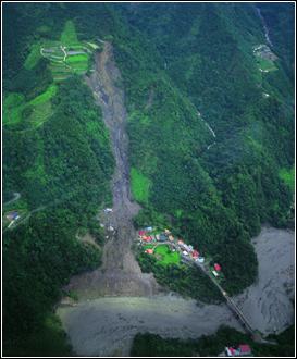 Songhe Communityis located in Heping Township, Taichung County, it has two debris flow torrents, 848 residents in 394 households. The communitycarried out debris flow evacuation drills in 2000 and 2003. Typhoon Mindulle that severely hit Songhe Community on July 1, 2004 caused debris flow disasters (Fig.10) .