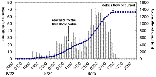 Typhoon Mindulle of 2004 caused debris flow disasters in several locations, and damaged houses and bridges. However, there were no casualties due to the debris flow warning, allowing residents to be evacuated beforehand (Fig.9).