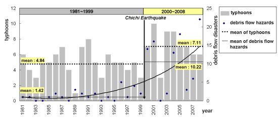 Fig. 16 Historical occurrences of typhoon and debris flow disaster in Taiwan (CWB, 2009, Yao, 2000, Chen, et al., 2002, SWCB, 2008b) |