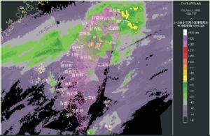 Since 2005, the release of debris flow warnings took the community as a unit. However, some areas have no rainfall station, thus, residents of communities nearby debris flow torrents have been recruited to form local professional volunteers in order to obtain local real-time rainfall data. The professional volunteers help with observations of local real-time rainfall, using a simple rain gauge and communication equipment. In addition to complementing rainfall data in areas lacking rainfall stations, they take part in announcing situations of disaster and evacuating residents. The Quantitative Precipitation Estimation and Segregation Using Multiple Sensors (QPESUMS) was bought in 2006 (Fig.4) for calculating and analyzing the predicted rainfall within next 1~3 hours in order to provide information of future rainfall trends for the response team, and strengthen the accuracy of debris flow warning analysis (SWCB, 2008b).