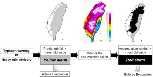 The mode of the debris flow warning system in Taiwan was changed into two levels in 2005, which are classified as the alarm levels of yellow and red (Fig.5). When the predicted rainfall is greater than the threshold value for debris flow warning, a yellow sign is released to the possible-affected community, and the local government should advise residents of evacuation. When the actual rainfall accumulation reaches the threshold value for a debris flow warning, it will be a red sign, and the local government must enforce public evacuation. Therefore, rapid notification is required to inform the public of evacuation. A red sign announcement or when the rainfall accumulation observed by the community reaches the debris flow warning value also mobilizes local police and rescue units for assistance. Those who refuse to evacuate will be forced to evacuate to safe shelters. As the procurement of rainfall information and warning release methods have been improved since 2005, the early warning system for debris flows of Taiwan enters into a relatively perfected stage. The process can be illustrated in the following case study.