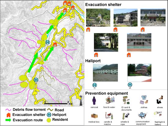 Shenmu Community is located in Shinyi Township, Nantou County; it has 969 residents in 338 households, as well as 13 debris flow torrents. In 1996, Typhoon Herb caused many debris flow disasters, damaging several houses and caused the roads to crumble. Many debris flows occurred in May 1998, and May and July 1999, which destroyed bridges and besieged residents. Shenmu Community carried out a debris flow evacuation drill in June 2001 in order that residents and related units were familiar with the evacuation process, and thus, it became one of the rare debris flow resistant communities to experience evacuation drills in Taiwan. Figure 6 is the map for evacuation that made by residents and experts. Typhoon Toraji of 2001 and Typhoon Mindulle of 2004 caused heavy casualties all over Taiwan; however, there were no deaths in Shenmu Community, even though there were numerous debris flow torrents (Fig.7), because the residents were evacuated in advance.