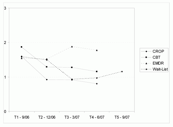 As can be seen from Figure 2, the CROP and the CBT Group improved markedly during the interventions between T1 and T2 and the Wait List Control Group did so during the intervention which took place between T2 and T3. In contrast, the EMDR Group did not improve. For the HTQ, Repeated Measures ANOVA revealed that the CROP-Groups (N = 12) were significantly superior to the Wait-List condition (N = 16), as far as improvement from T1 to T2 is concerned (p = .002) and thus, Hypothesis 1 was confirmed. According to Hypothesis 2, we had expected that the CROP-Condition, the CBT- and the EMDR-condition would not differ significantly from each other over T1, T2, T3, and T4, or that CROP would be significantly superior to CBT and EMDR. Repeated Measures ANOVA showed that CROP (N = 9) and CBT (N = 10) did not differ significantly from T1 to T4 (p < .549). The CROP-Condition (N = 9) was significantly superior to the EMDR-Condition (N = 5) from T1 to T4 (p < .005). Thus, Hypothesis 2 also was confirmed with respect to the HTQ. Hypothesis 3 had postulated that the CROP-Groups, as compared to the Wait-List condition would achieve effect sizes of at least 1.00. The initial HTQ mean scores at T1 for the CROP-Group and the Wait-List Control Group were 2.87 (SD = 0.55, N = 12) and 2.58 (SD = 0.58, N = 16) respectively. At T2, the CROP-Group had a mean of 2.20 (SD = 0.65, N = 12), while the Wait-List Control Group had a mean of 2.48 (SD = 0.66, N = 16). From these data, an effect size of 0.94 was computed. Thus Hypothesis 3, which had predicted an effect size of at least 1.00 was not confirmed.